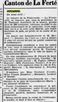 Quelques années plus tard, il est élu président de cette association, un poste qu’il occupe avec passion et rigueur. Sous sa direction, « La Fraternelle » organise des événements pour collecter des fonds, et Auguste n’hésite pas à participer lui-même aux spectacles, se produisant sur scène aux côtés de son épouse. Lors d’un gala de bienfaisance en 1936, il incarne avec humour le maire de Courcelles-sur-Morin, offrant ainsi une soirée de divertissement tout en récoltant des fonds pour les anciens combattants.
